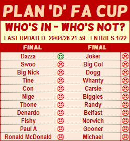 PLAN ‘D’ SEASON 2025/26 Enter your NAMEYour SCORES (From 0-9 Only!)The NUMBER of your JOKER GAMEThen SUBMIT Premiership Fixture 35 Premiership Fixture 35 Starts Friday 01-May-26 20:00 35 Name Leeds v Burnley (Fri 1) Game 1 H H A A Brentford v West Ham (Sat 2) Game 2 H H A A Newcastle v Brighton (Sat 2) Game 3 H H A A Wolves v Sunderland (Sat 2) Game 4 H H A A Arsenal v Fulham (Sat 2) Game 5 H H A A Bournemouth v Crystal Palace (Sun 3) Game 6 H H A A Man Utd v Liverpool (Sun 3) Game 7 H H A A Aston Villa v Tottenham (Sun 3) Game 8 H H A A Chelsea v Nottm Forest (Mon 4) Game 9 H H A A Everton v Man City (Mon 4) Game 10 H H A A Joker Joker Game No. Submit If you are human, leave this field blank. RULES AND REGS